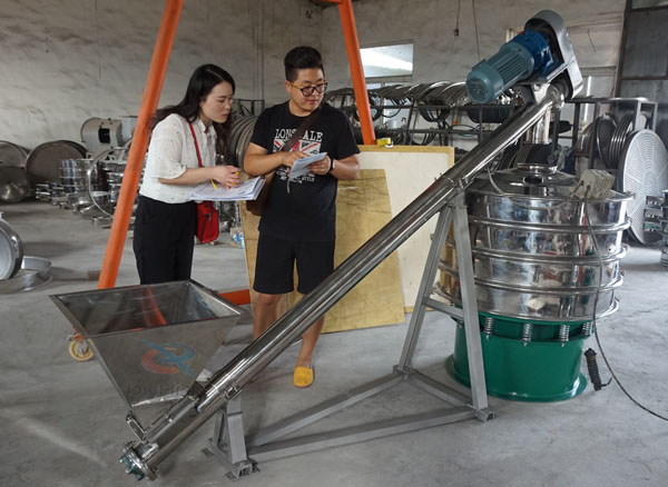 螺旋輸送機為不銹鋼材質跟旋振篩配套使用,進料口端加不銹鋼料斗,方便進料;該旋振篩為不銹鋼旋振篩,底桶為碳鋼材質,與物料接觸為不銹鋼材質。