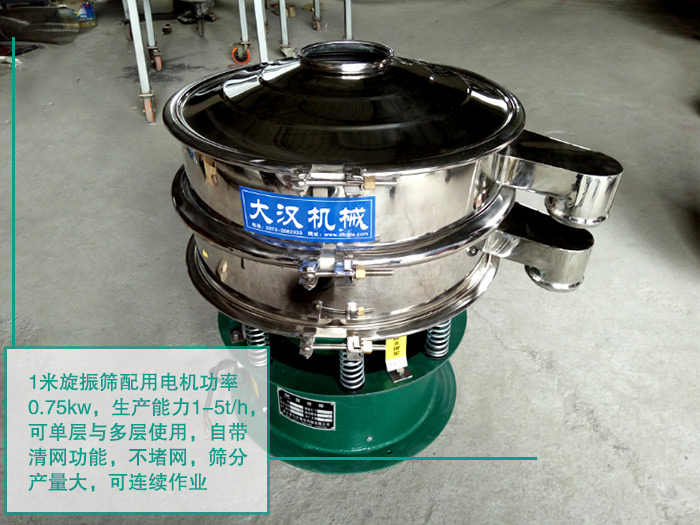 1米旋振篩配用電機功率0.75kw,生產能力1-5t/h,可單層與多層使用,可裝單層對魚粉進行除雜,也可以裝多層篩網,對魚粉實現分級功能。 同時自帶彈跳球,自帶清網功能,不堵網,篩分產量大,可連續作業。特別適合高品質、精細粉體的用戶使用。