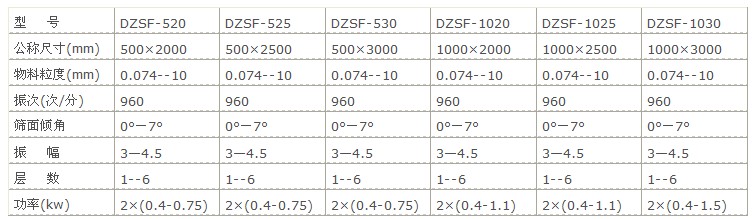 DZSF系列直線振動篩為雙振動電機驅動。當兩臺振動電機做同步、反向旋轉時,其偏心塊所產生的激振力在平行于電機軸線的方向相互抵消,在垂直于電機軸的方向疊為一合力,因此篩機的運動軌跡為一直線。兩電機軸相對篩面在垂直方向有一傾角,在激振力和物料自重力的合力作用下,物料在篩面上被拋起跳躍或向前作直線運動,從而達到對物料進行篩選和分級的目的。適用于粒度在0.074—5mm,含水量小于7%,無粘性的各種干式粉狀或顆粒狀物料的篩分。大給料粒度不大于10mm.。