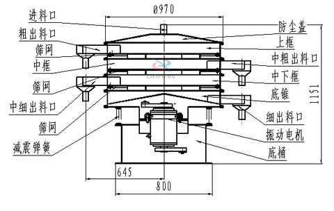 1000型三層不銹鋼旋振篩結(jié)構(gòu)圖: