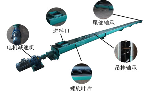 U型螺旋輸送機工作時,電機帶動旋轉的螺旋葉片將物料推移而進行輸送,螺旋輸送機旋轉軸上焊的螺旋葉片,葉片的面型根據輸送物料的不同有實體面型、帶式面型、葉片面型等型式