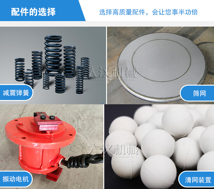 三次元旋振篩配件包括篩網,振動電機,清網裝置,減震彈簧等,篩分物料和產量不同,選擇的篩網,振動電機以及清網裝置是不同的,距離來說,常見的清網裝置有彈跳球清網裝置、超聲波清網裝置,這兩者的選擇在于物料的難篩程度,針對高粘性,易于堵網的物料,大漢廠家還是建議您選擇超聲波清網裝置,清網效果會更好。