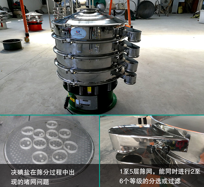 不銹鋼振動篩內(nèi)部裝配有彈跳球清網(wǎng)裝置,可以有效解決碘鹽在篩分過程中出現(xiàn)的堵網(wǎng)問題,提高了篩機(jī)的篩分效率。此外,不銹鋼振動篩可篩1至5層篩網(wǎng),能同時進(jìn)行2至6個等級的分選或過濾,篩分更加高效。 干凈衛(wèi)生